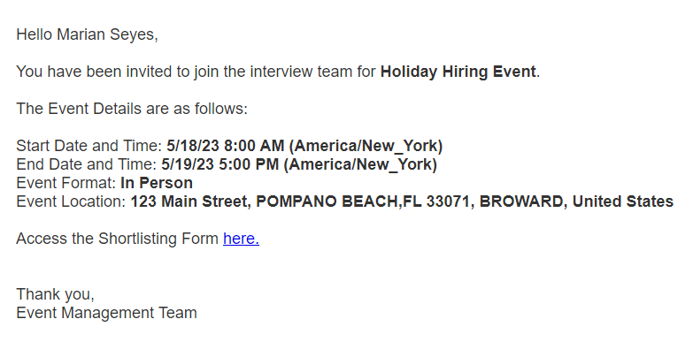 You can add and remove interviewers up until an event starts. Interviewers can either be permanent or contract employees of your company, and don't necessarily need access to Hiring Events in order to interview a candidate. Once an event is posted, the interviewers you've selected will receive a link to a shortlisting form either in an email message, or in a notification message on the bell icon.