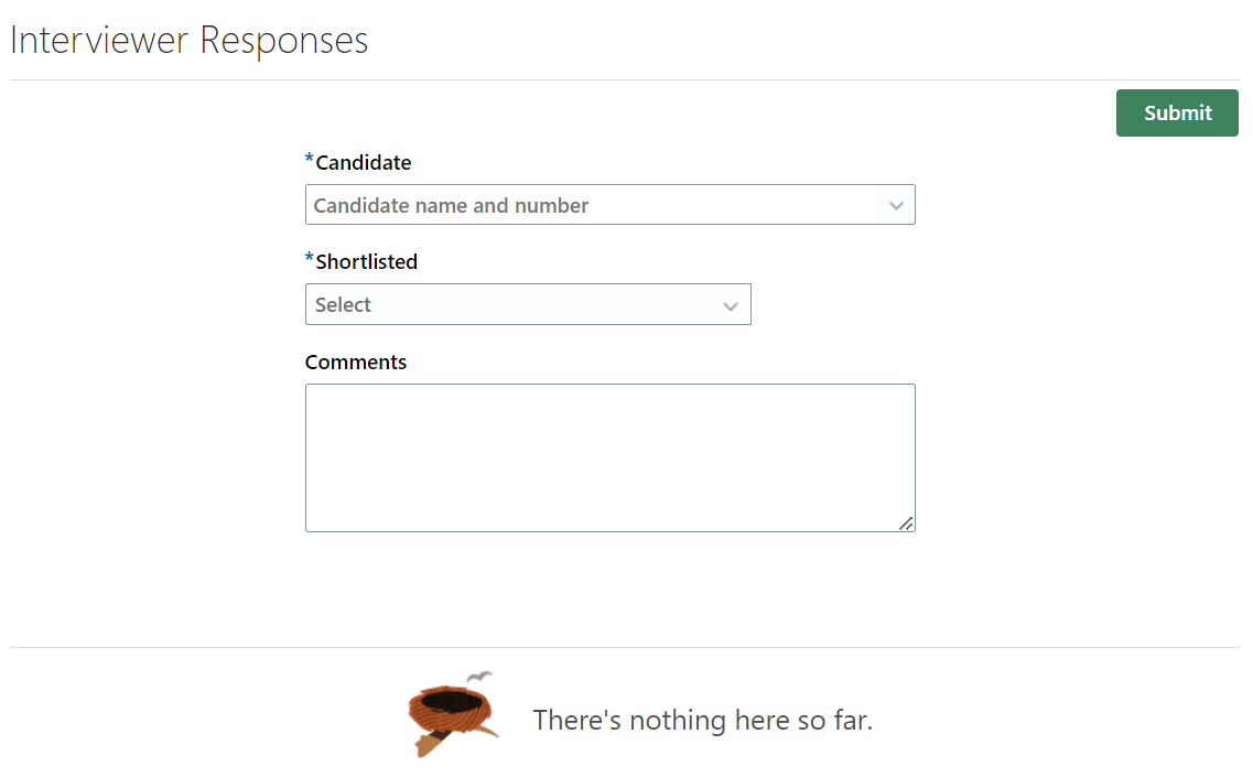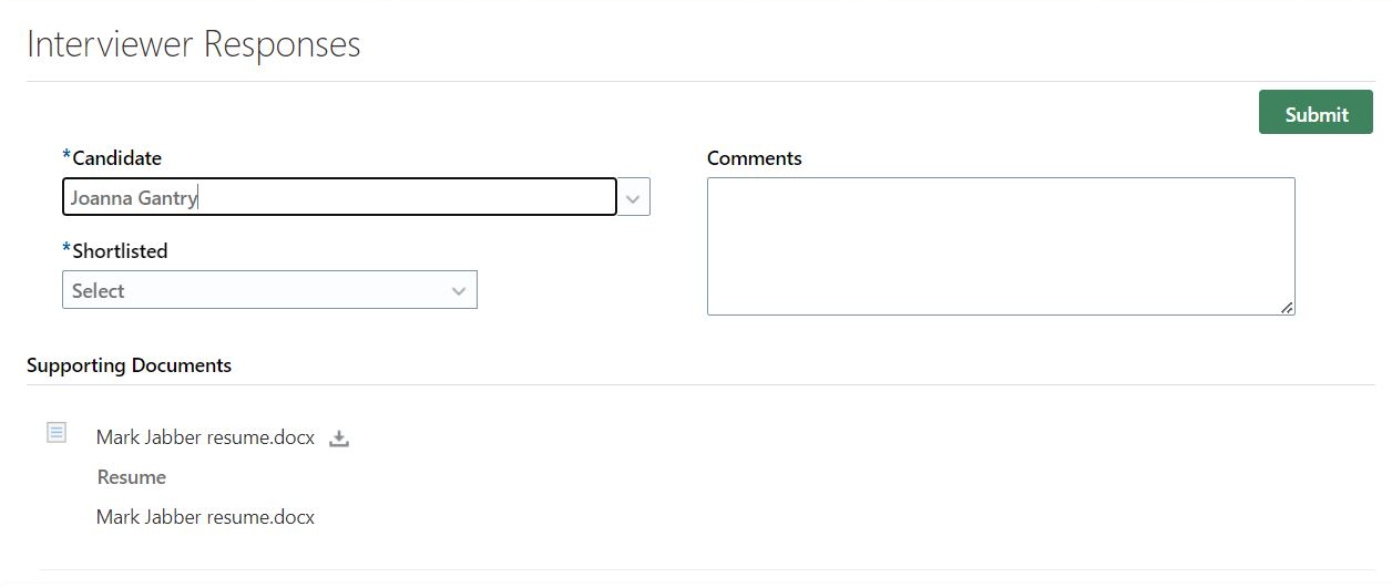 The interviewer speaks to the candidate, indicates on the form whether they are shortlisting the candidate, and optionally provides comments. Once the interviewer clicks Submit, the candidate's information moves to a new section called Submitted Responses, and the interviewer moves on to the next candidate. A candidate for whom a response has been submitted will automatically disappear from the candidate drop-down list so that no other interviewer can mistakenly select and enter feedback for the same candidate.