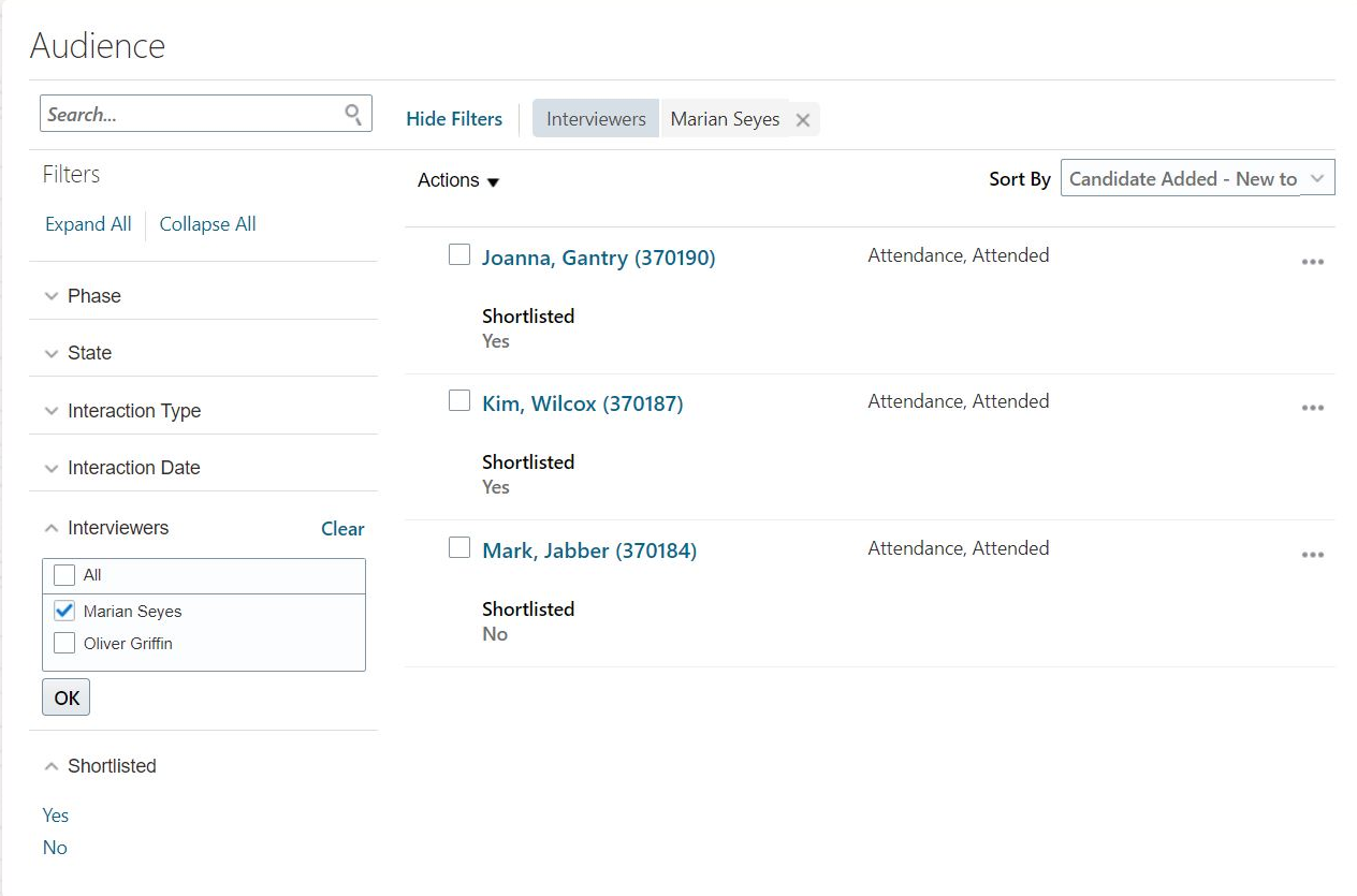 In the Scheduled Interviews tab of the Coordinator Interviews work area, you can use a new filter: Interview Participation. Two options are available: