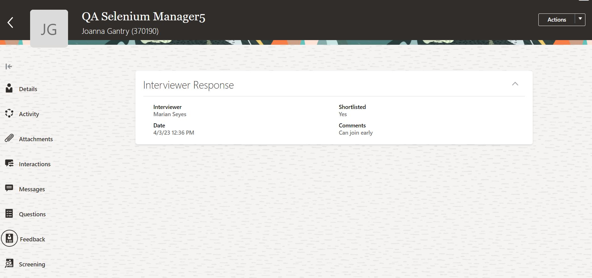 From the activities list, users can take action directly using an Action button or an action from the Actions menu. Depending on the action, users are taken to the Hiring work area, either in the job requisition, job application, or job offer details page. Or, for some actions, an action panel opens and users can perform the action directly in the Recruiting Activity Center without having to go to Hiring.