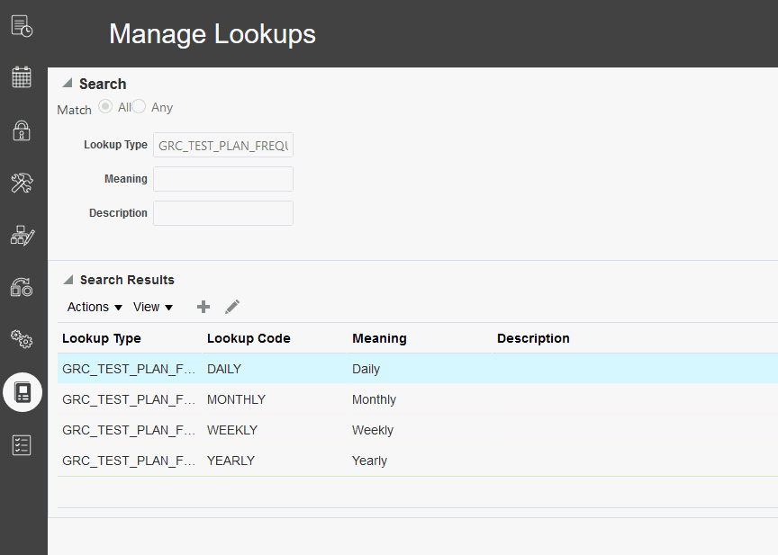 The GRC_TEST_PLAN_FREQUENCY lookup type is predefined with multiple lookup codes and meanings. You cannot update the predefined values. However, you can create new lookup codes and meanings.