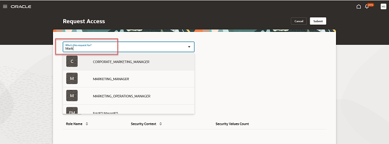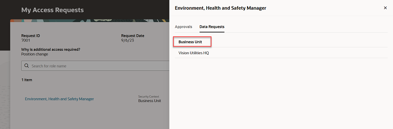 Records of role requests include a Data Requests drawer. If data security is included in a role request, the drawer now documents both the security context and the security value for the request. In earlier releases, it showed only the security value.