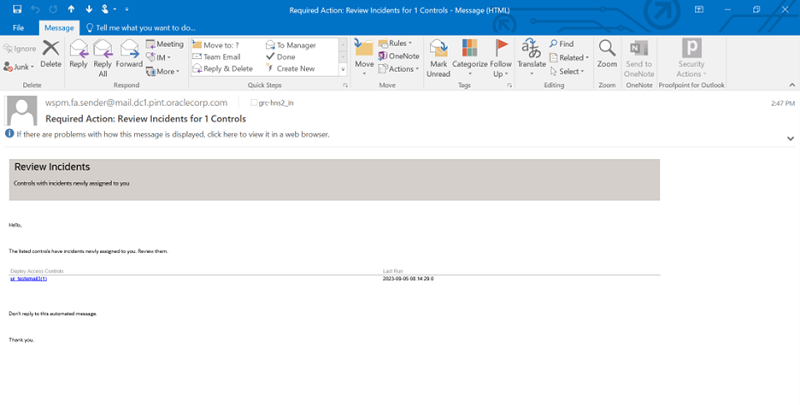 Result investigators now receive notifications not only when controls generate incidents, but also when investigators are assigned to incidents after the incidents are generated. To manage this information, you can use the Settings for Email Alerts and Notifications for the Advanced Controls business area and the Incident object.