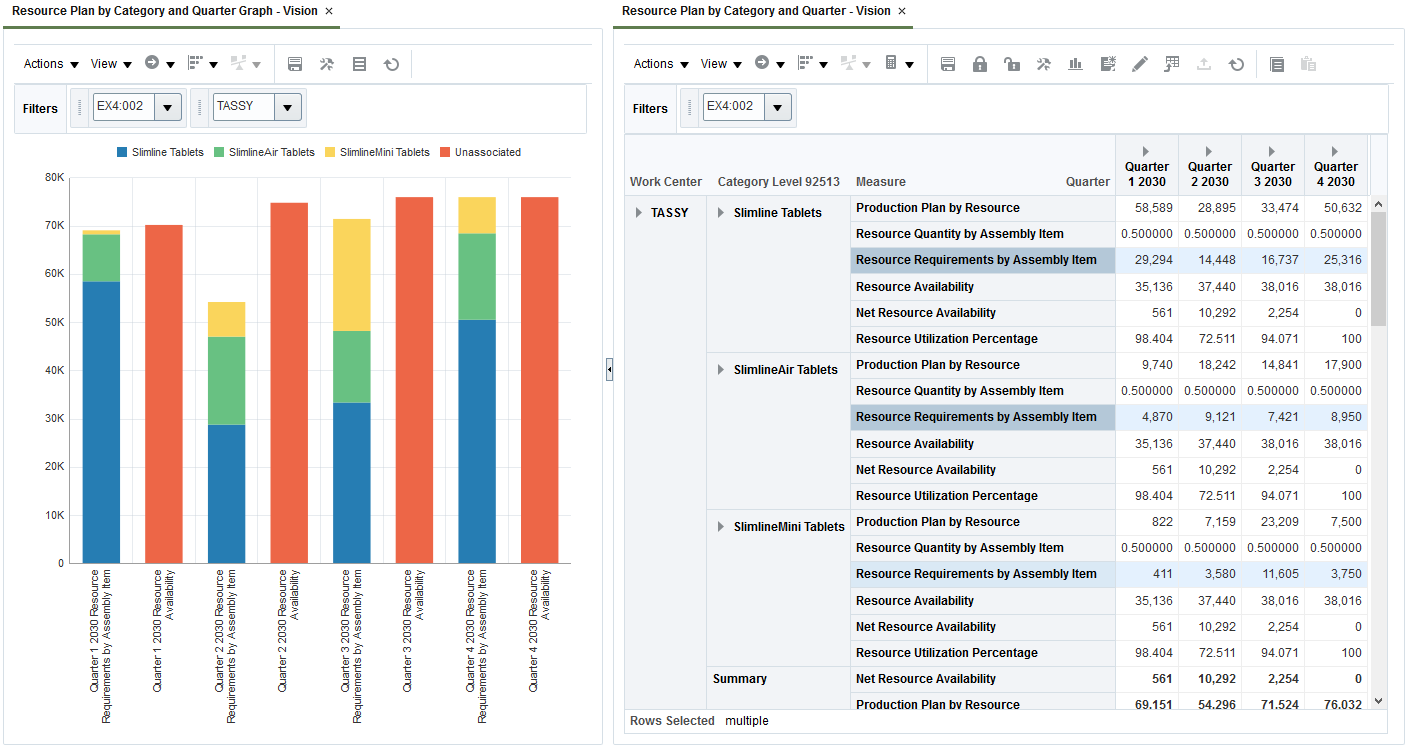 A new graph named Resource Plan by Category and Quarter Graph compares Resource Requirements by Assembly Item with Resource Availability. Resource Requirements by Assembly Item is displayed as a bar chart stacked by product category. Resource Availability is an existing measure that has resource as a conforming dimension, not product, so it isn't associated with assembly items. By using the graph to analyze resource loading, you can use both the Net Resource Availability (also an existing resource measure not conforming to the product dimension) and Resource Quantity by Assembly Item measures in the table to determine how many more assembly items could be produced.