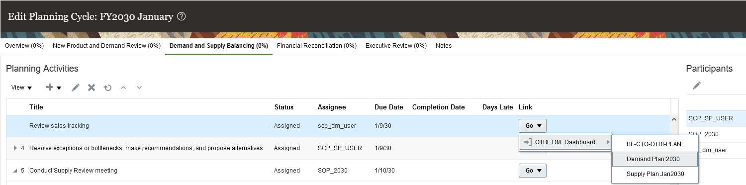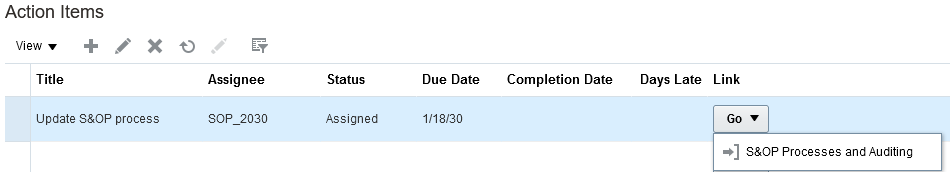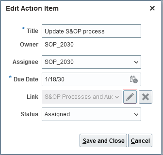 Additionally, you can link planning cycle activities, tasks, action items, and decision items to an external system. For example, if you have a task to analyze the financial forecast in your Oracle Cloud Enterprise Performance Management (EPM), you can configure the link from Oracle Cloud Sales and Operations Planning to your EPM application.