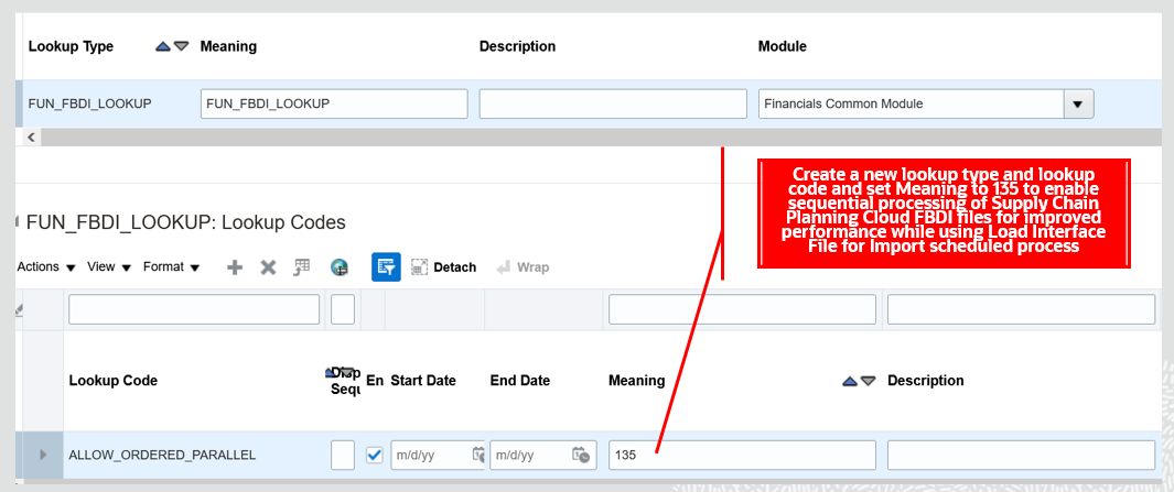 - If you haven't configured the lookup type FUN_FBDI_LOOKUP and lookup code ALLOW_ORDERED_PARALLEL, then the Load Interface File for Import scheduled process loads data for Supply Chain Planning Cloud with existing parallel processing logic.