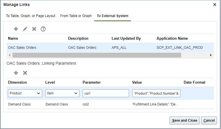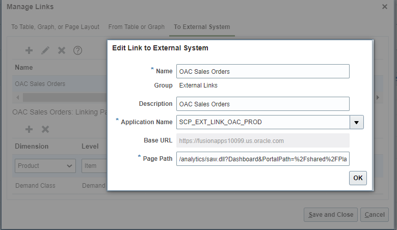 Create or edit links to external systems for planning tables and graphs using the application name defined in the Setup and Maintenance work area and context parameters.