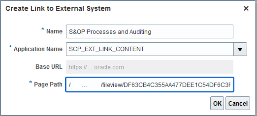 Use the application name defined in the Setup and Maintenance work area to configure a link for a planning cycle task. Page Path is combined with the Base URL to construct the complete URL to an external system.