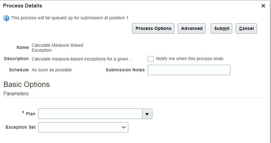 You can use the Scheduled Processes page in the Scheduled Processes work area to provide the process details for the Calculate Measure Based Exception process and start the process.