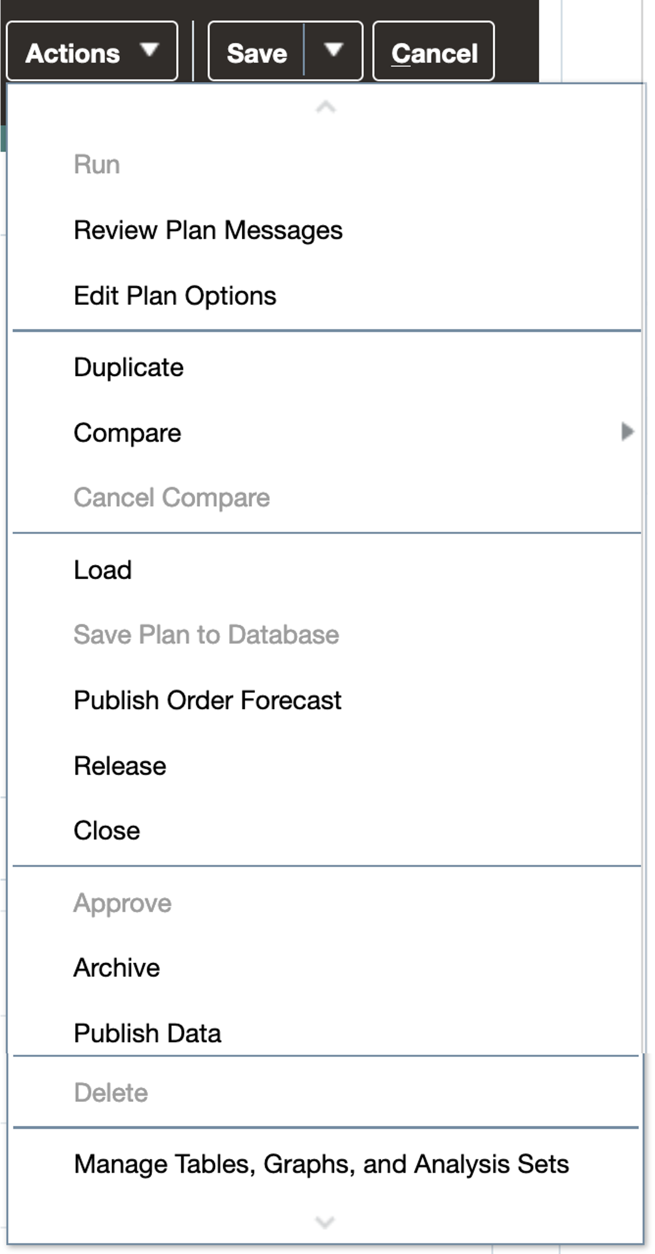 As you can see in the preceding image, the options in the Actions menu for a limited access user are restricted. The Run, Save Plan to Database, and Delete actions are disabled. Also, changes to the Plan Options page aren't allowed. For example, a limited-access user can't assign user access, make any changes to scope, planning attributes, or advanced options. However a limited access user can review the setting for all plan options. The Save buttons on the Plan Options UI will be disabled for limited-access users.