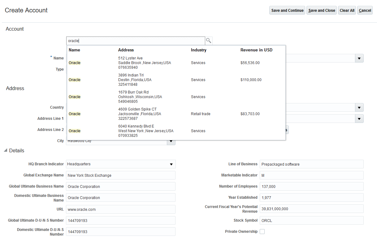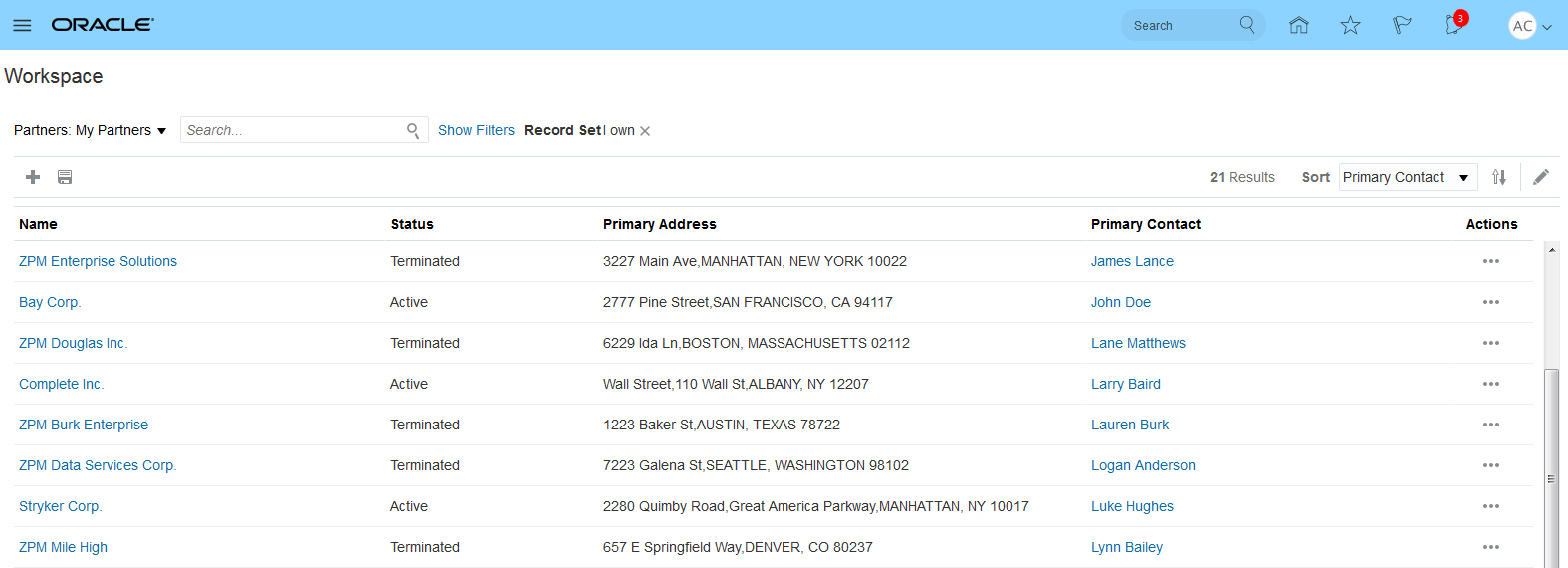 Salespeople and channel manager can search for and associate records using relevant data from extensible lists of values for partners. They can use custom fields as search criteria and view custom fields in work area search results, letting them find and select the right records easily