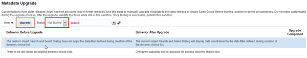 During your upgrade, most existing customizations made in Application Composer are automatically updated to the latest enhanced behavior in the new release. However, there are a few exceptions, which require you to manually initiate the upgrade script for each of those customizations.