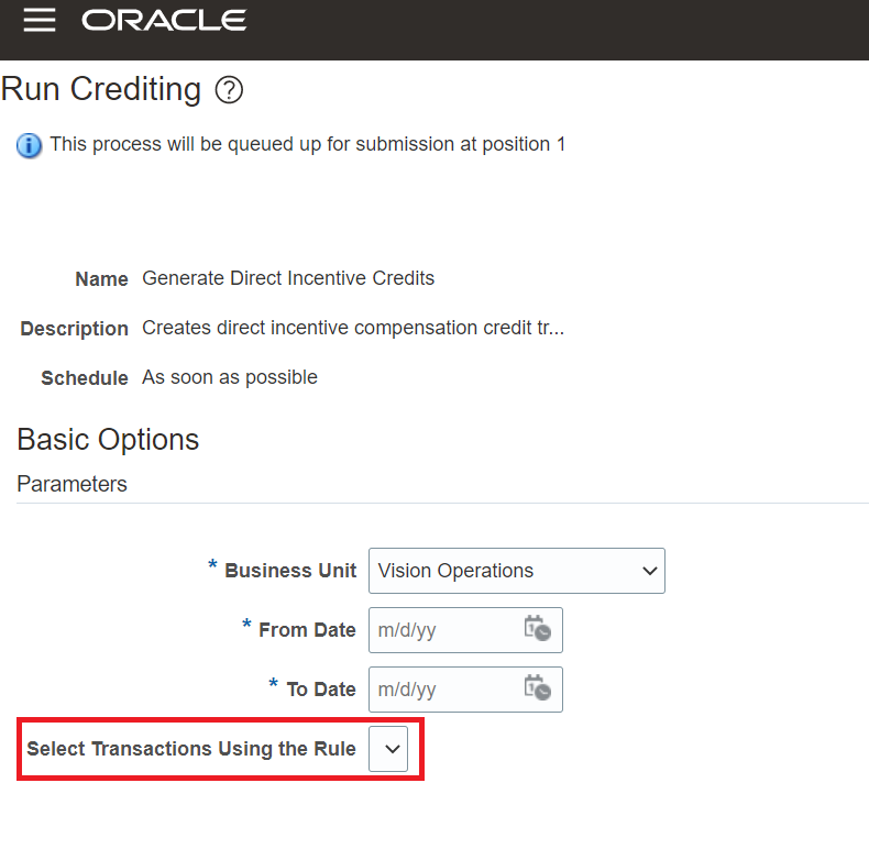 Run the crediting process for specific transactions within a date range using transaction selection rules. Create these transaction selection rules in the Manage Incentive Selection Rules task in Setup and Maintenance. Crediting runs only for those transactions that satisfy the criteria of the transaction selection rule you select. A selection rule is an optional parameter when you run the crediting process. If you don't pick a transaction selection rule, crediting runs for all the transactions within the selected date range.