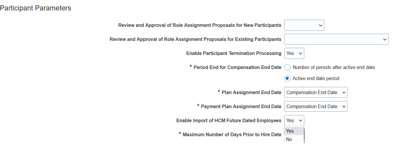 - Under the Participant Parameters section, set Enable Import of HCM Future Dated Employees to Yes.