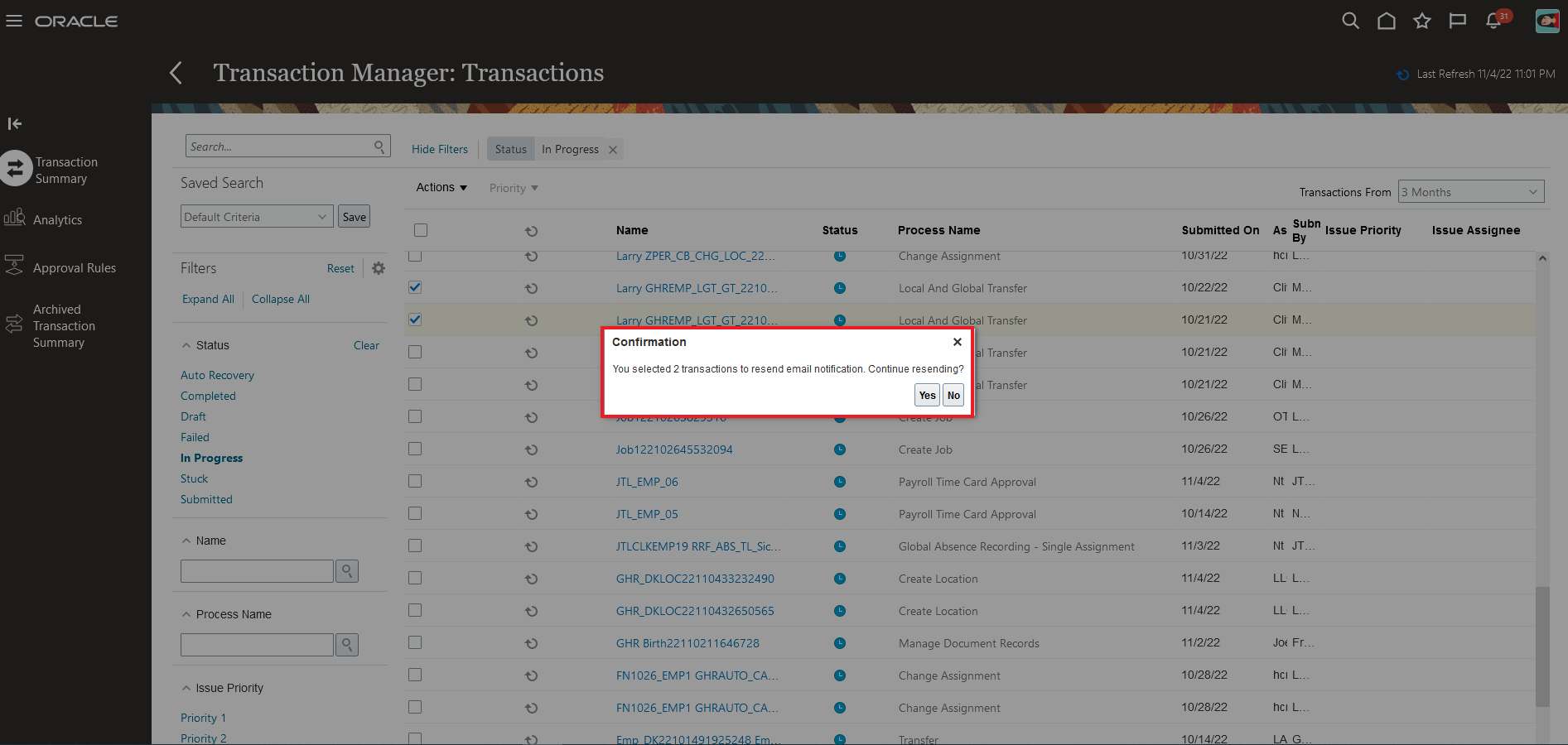 You can now resend approval email notifications for in-progress transactions. You can select one or more transactions in the Transaction Console page or drill-down to the Transaction details page for a transaction and use Resend Email Notification in the Actions menu to notify assignees.
