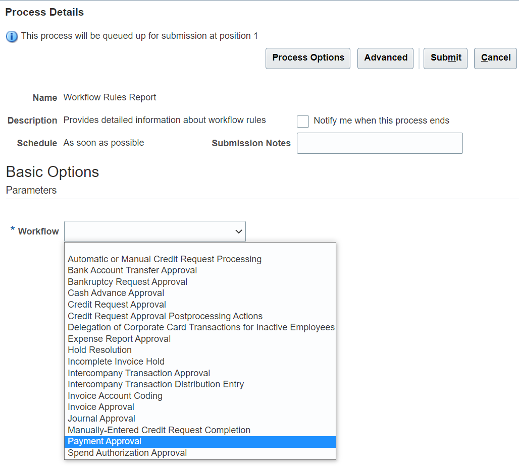 Use the enhanced Workflow Rules Report to review the rules configured in Oracle Business Process Management (BPM) for financial workflows. This report shows the details of rule conditions and approval routing for each rule. This report was first introduced in update 18C for Invoice Approval, Journal Approval, and Expense Report Approval workflows.