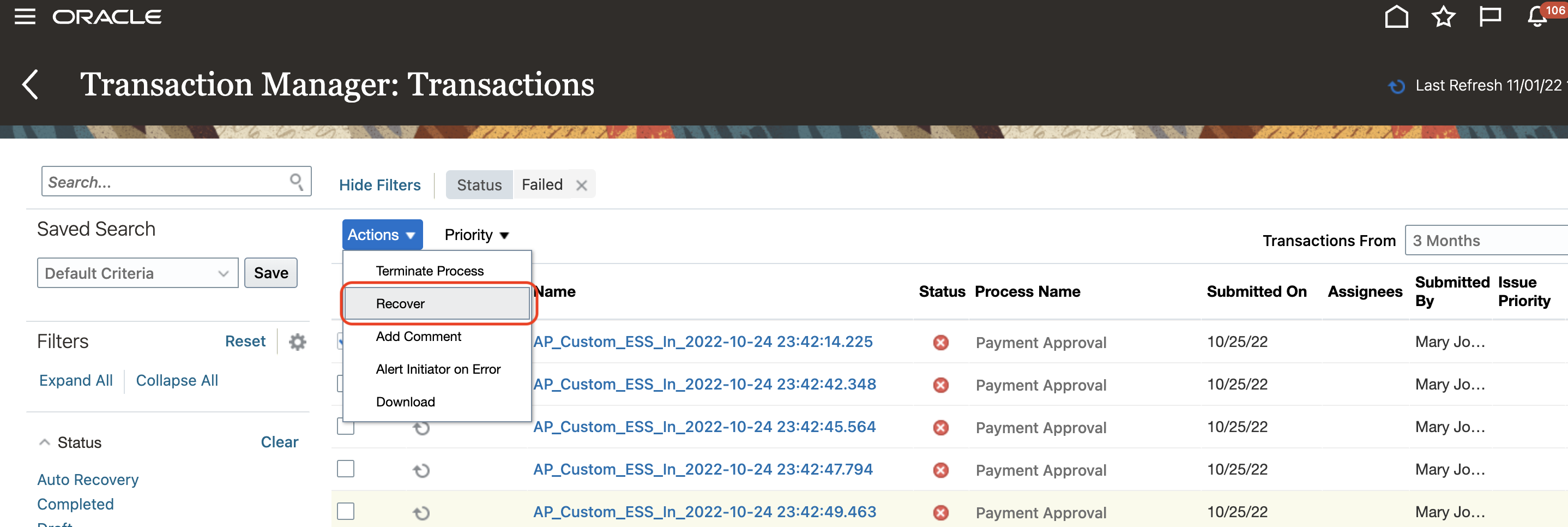 - For an overview of the Workflow Transaction Console feature, refer to the Manage Workflow Transactions topic on the Oracle Help Center.