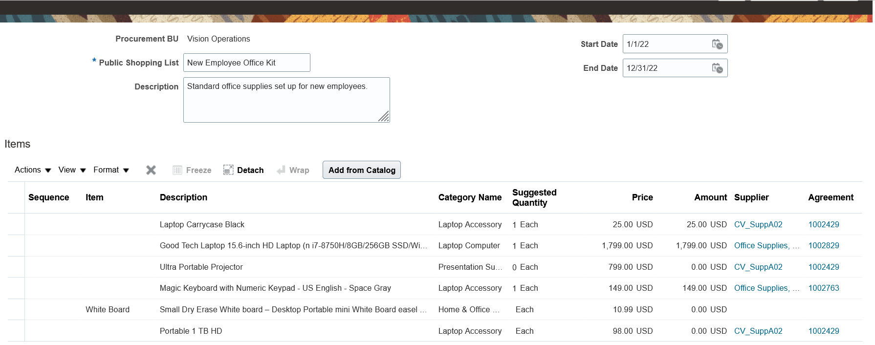 As a requester, you can now view the latest description for an agreement item when shopping in the Responsive Self Service Procurement application. Before this, the system always displayed the description from the blanket agreement line even if the item had an updated description in the item setup.
