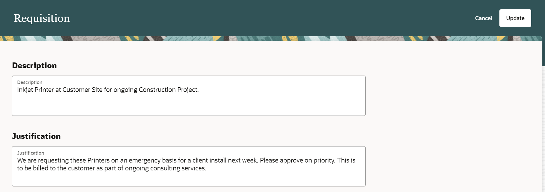 Justification details are provided at a header level in the Responsive Self Service Procurement application. You can create and edit these details while creating and submitting the requisition. Before this update, you couldn't enter the justification details directly on a requisition.