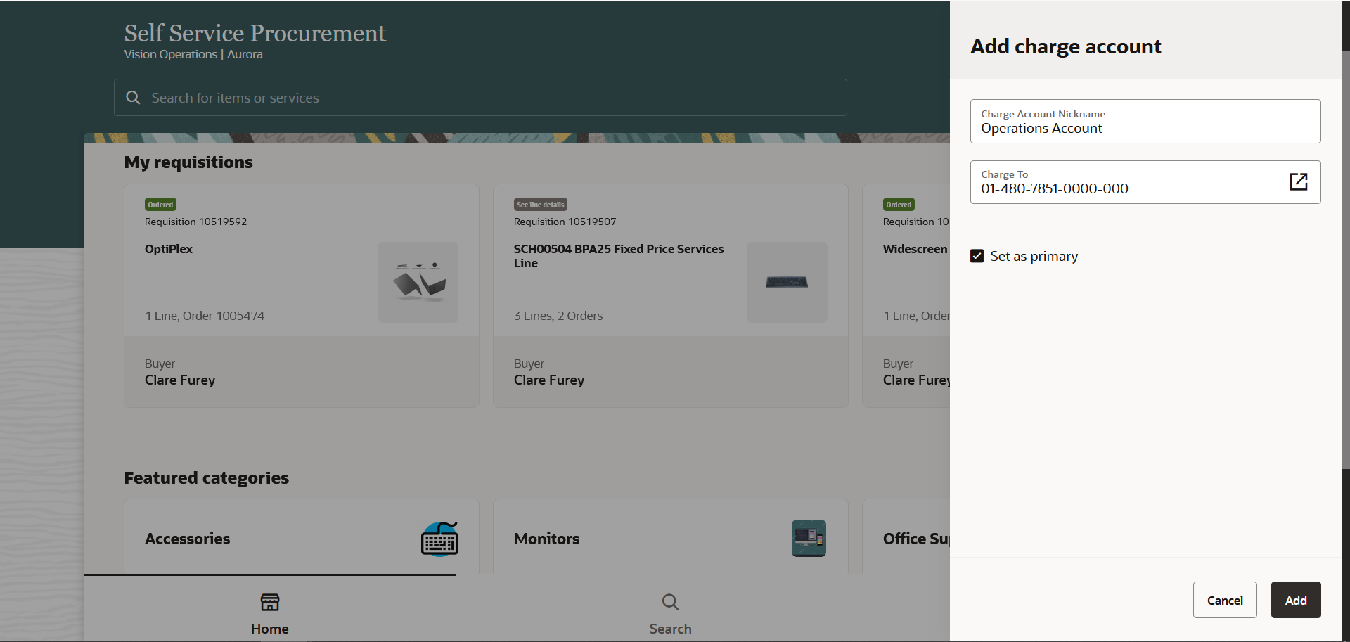 You can use the Charge accounts section to add a nickname for a charge account and set it as your primary charge account.