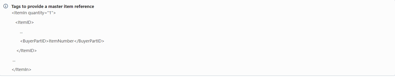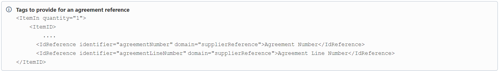 Here are snapshots of the tags you can use to provide a master item and agreement reference: