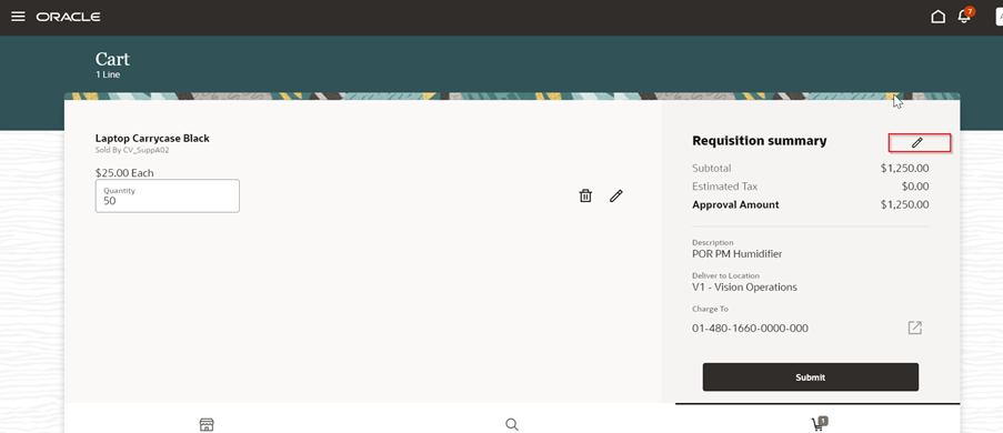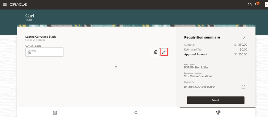 In this update, the Shopping Cart page is optimized, keeping in mind key information to be displayed and performance. The Deliver-to Location (where the deliver-to location is different on lines) continue to be displayed for each requisition line in the Shopping Cart. To view other line-level details such as Delivery Date, Charge Account or Notes and Attachments, you can edit individual lines where these details are available.