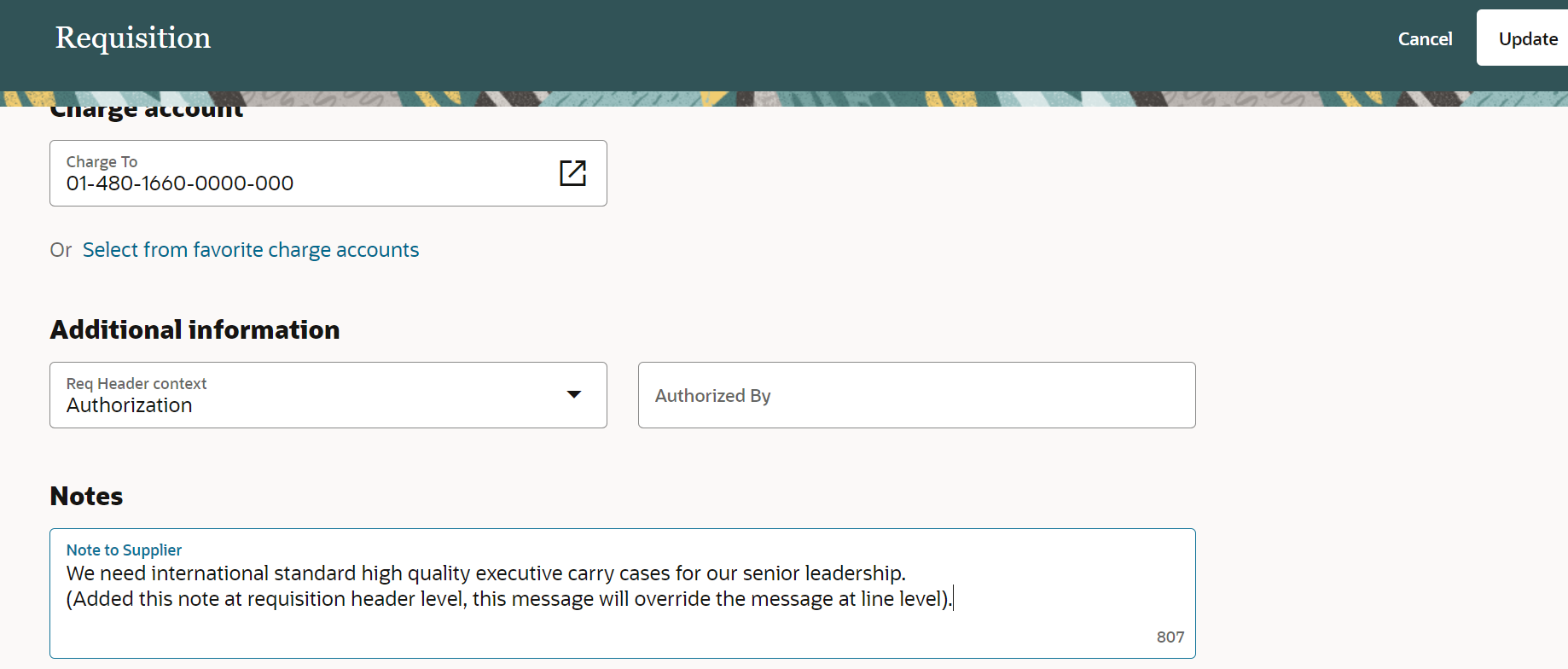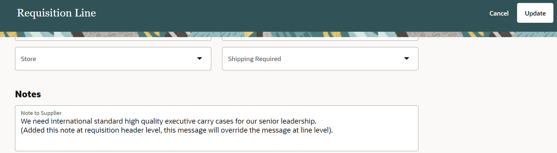 You can add Notes at a header level or for each specific requisition line in the Responsive Self Service Procurement application. To create, edit, or view these details, you must navigate to the edit requisition line or the edit header from the Shopping Cart page. Any notes you add at the header level overwrite notes that may exist on individual lines. Before this update, you couldn't add notes to a requisition created in the Responsive Self Service Procurement application.