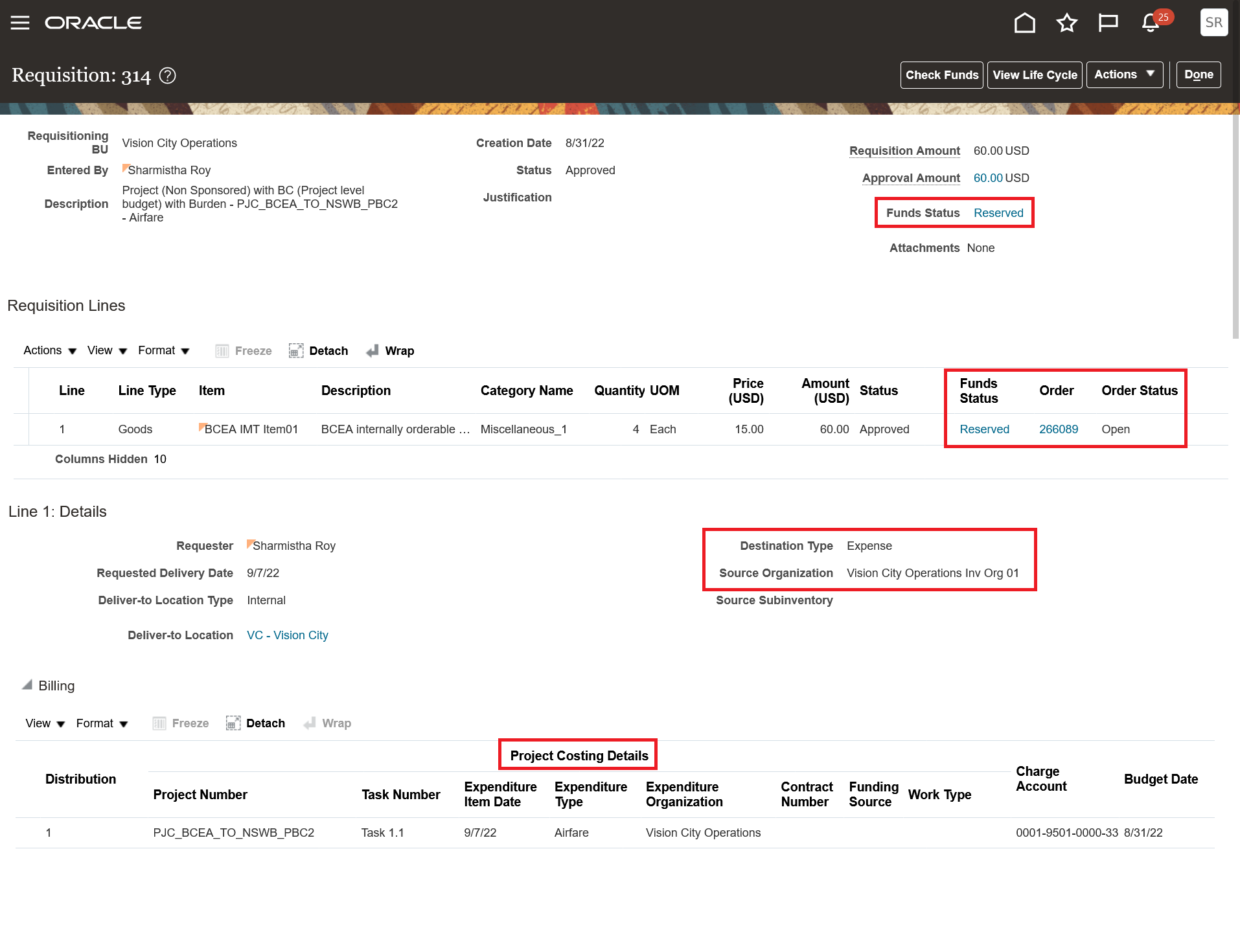 - Check for funds availability for internal material transfer requisitions that are expensed to projects.