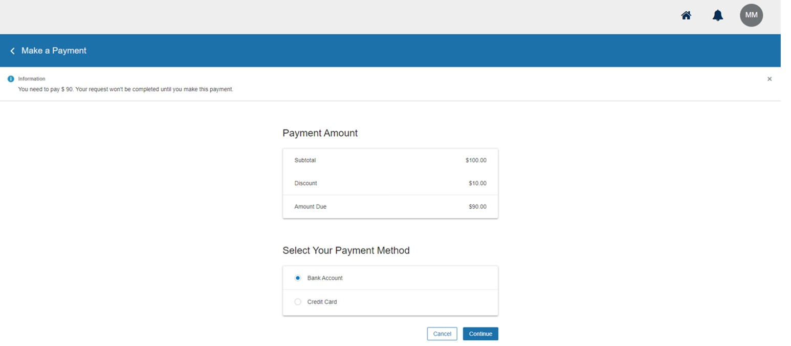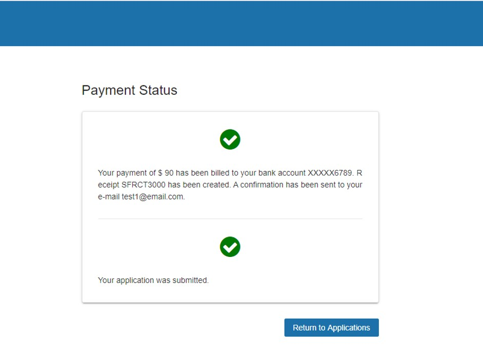 Successful payment is required for their application to be considered "submitted"; if payment fails, their application remains in "In progress" status until the fee is paid. On their self service Finances page, users will see paid application fees in their list of transactions.