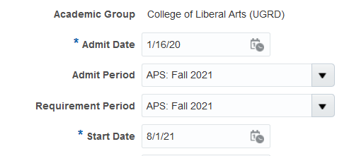 - In the Admissions Application Information section, select an Admit Start Type of Period.