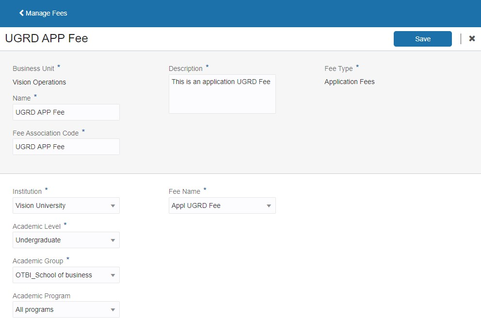 Administrators can set the fee at the academic level (for example, to apply to all continuing education programs if the application fee is the same), to an academic group, or at a specific academic program level.