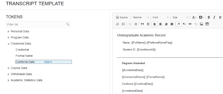 The Transcript Template section is now available in the Manage Transcript Types task. Use the text editor area to format your data. To insert tokens from the collapsible list, place your cursor in the text editor area, select a token, and click Add. If you are familiar with the syntax, for example {{AcademicLevel}}, you can also type the code in the text editor area.