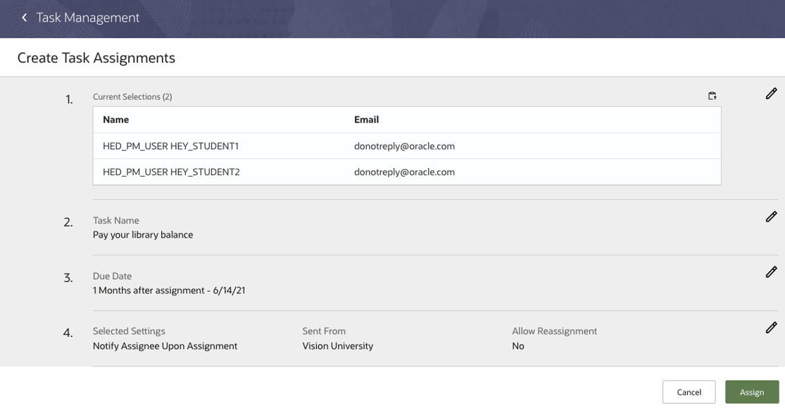 Assign tasks and checklists in different areas of Student Management Cloud with an updated, unified task and checklist assignment wizard. See summary and detail information while progressing through the wizard to maintain context of the task or checklist being assigned and to ensure accuracy of assignments.