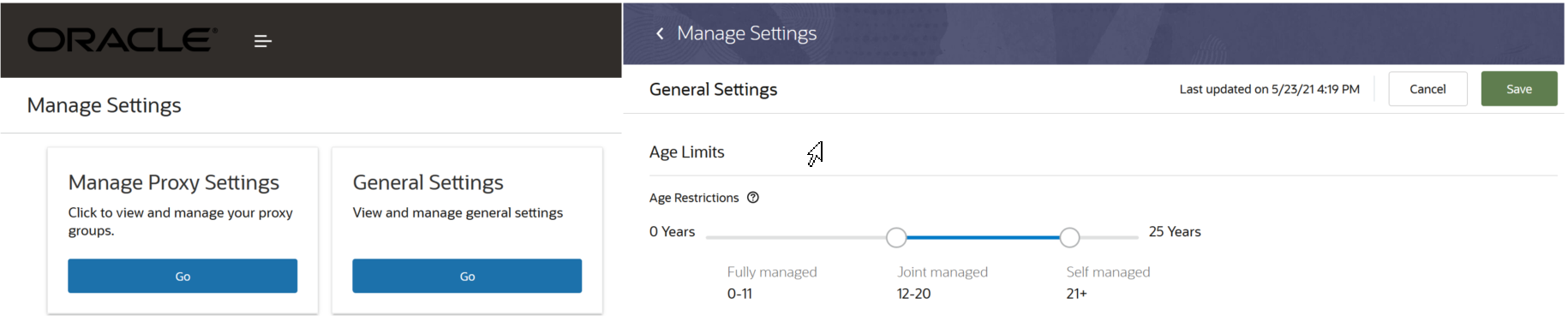 Configure age limits to identify a person as fully-managed, joint-managed or self-managed. Here are the differences between the management levels for a person:
