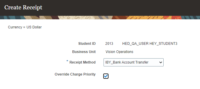 When creating new receipts, the Receipt Method will be blank, and Override Charge Priority is not selected. These are the default settings. As soon as you select a receipt method, the list of eligible charges is populated with ones that the receipt or payment in context can be used with. When you select Override Charge Priority, you can add other charges that weren't a part of the original list of eligible charges. To create new receipts, go to the Finances work area, click the Student tile, search for the student, then click the name. From the student's account page, click Actions > Create Receipt.