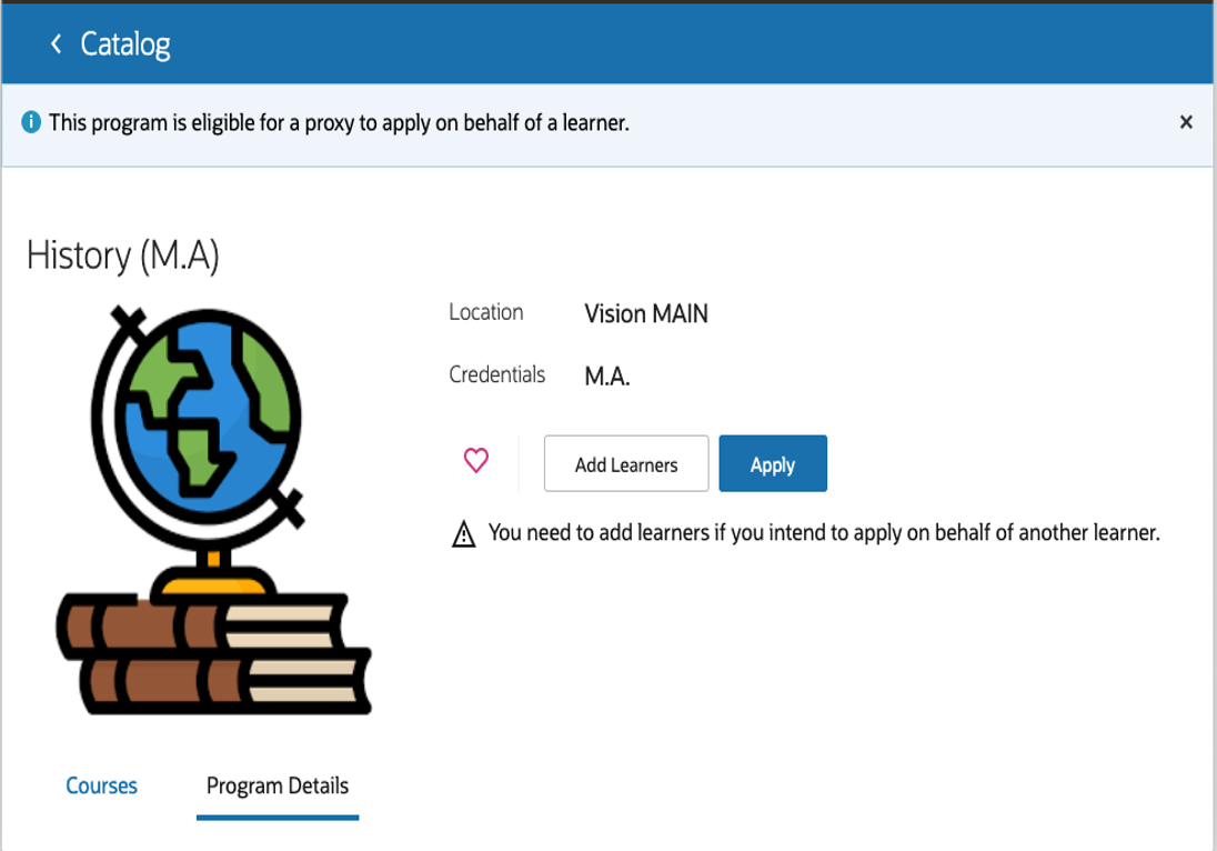 Add a proxy eligible tag to an academic program to require applications for the program to be submitted by a proxy user on behalf of a learner. Programs with the proxy eligible tag guide an applicant to add learners before they can apply to the program. Additionally, applicants are navigated to the program details page when accessing forms via a direct URL for a more consistent user experience.