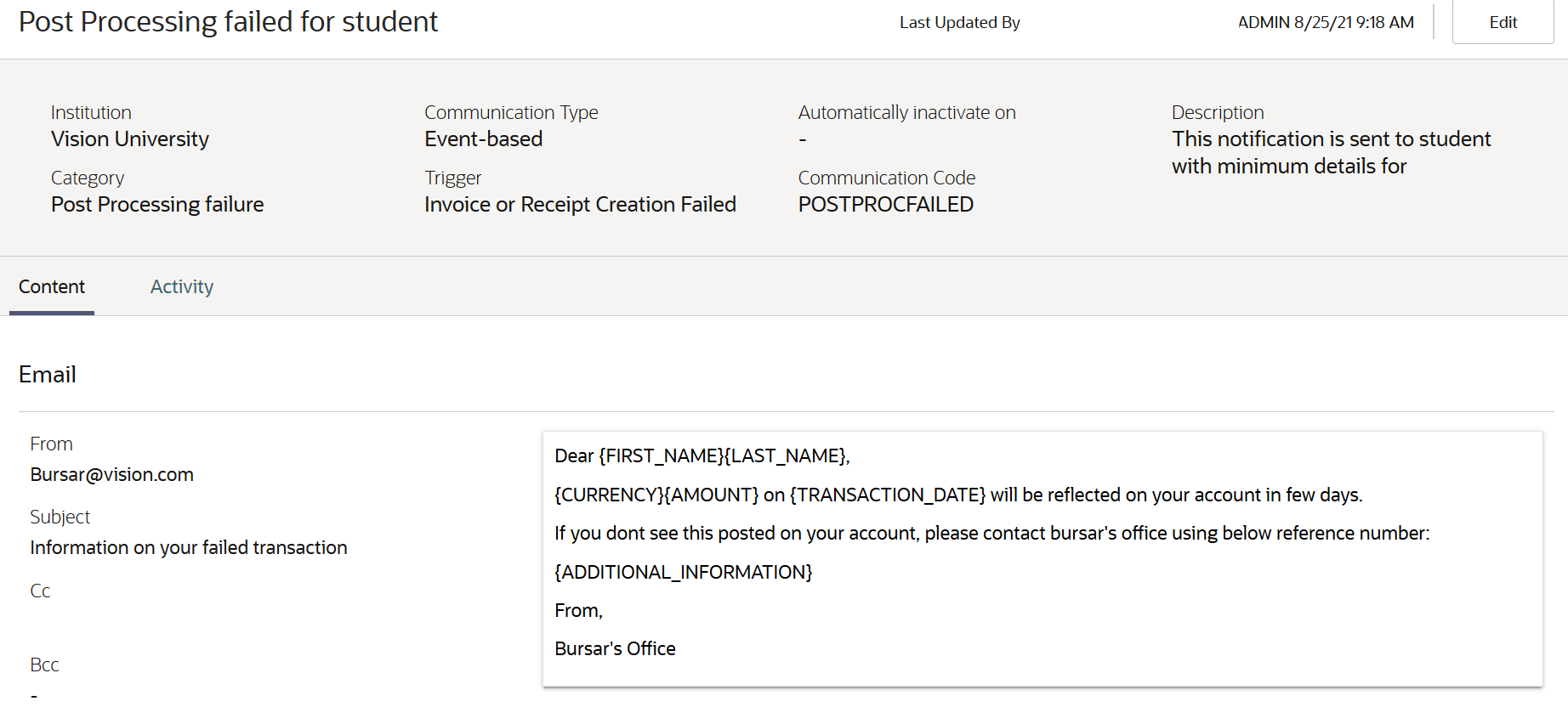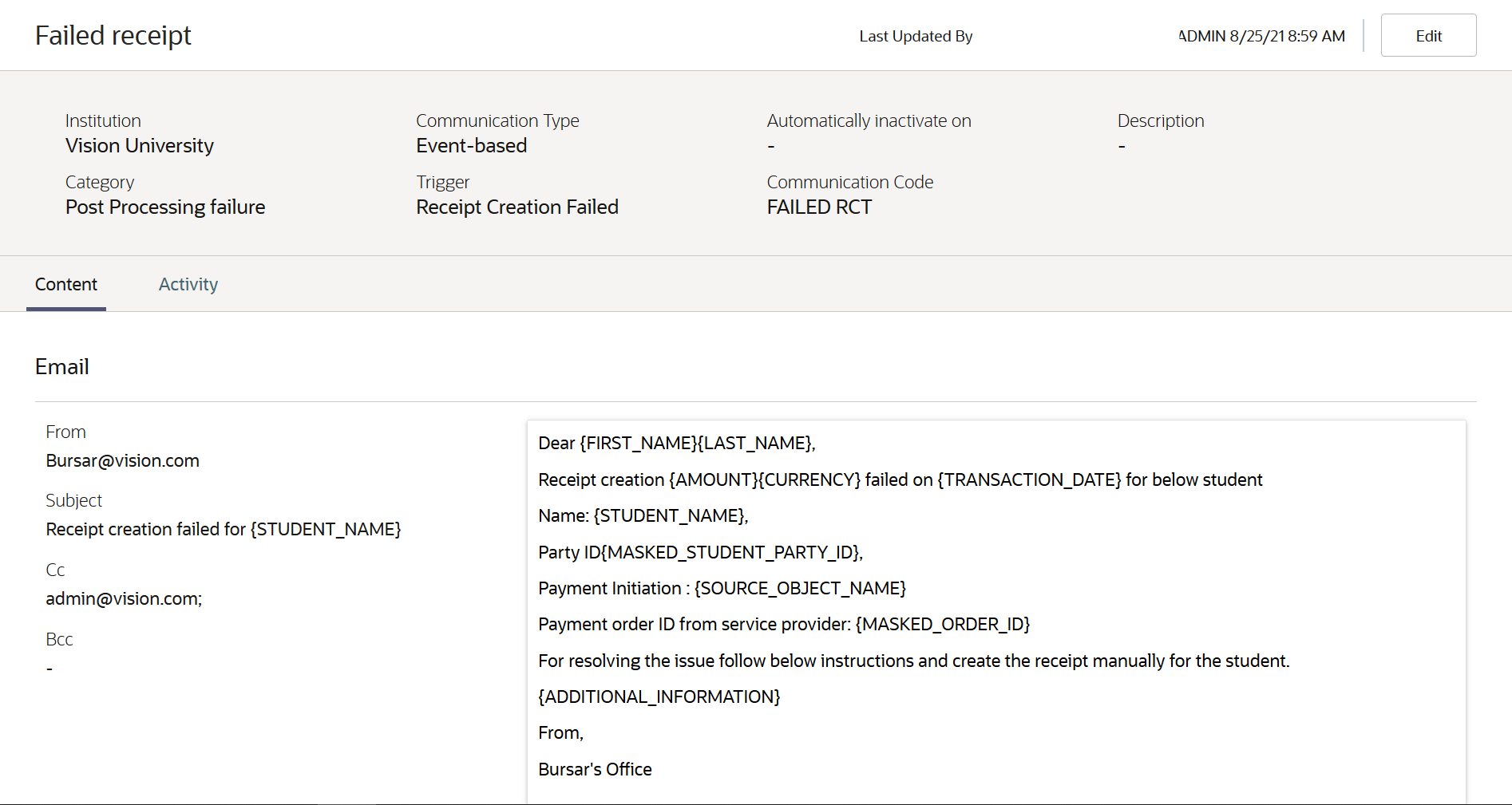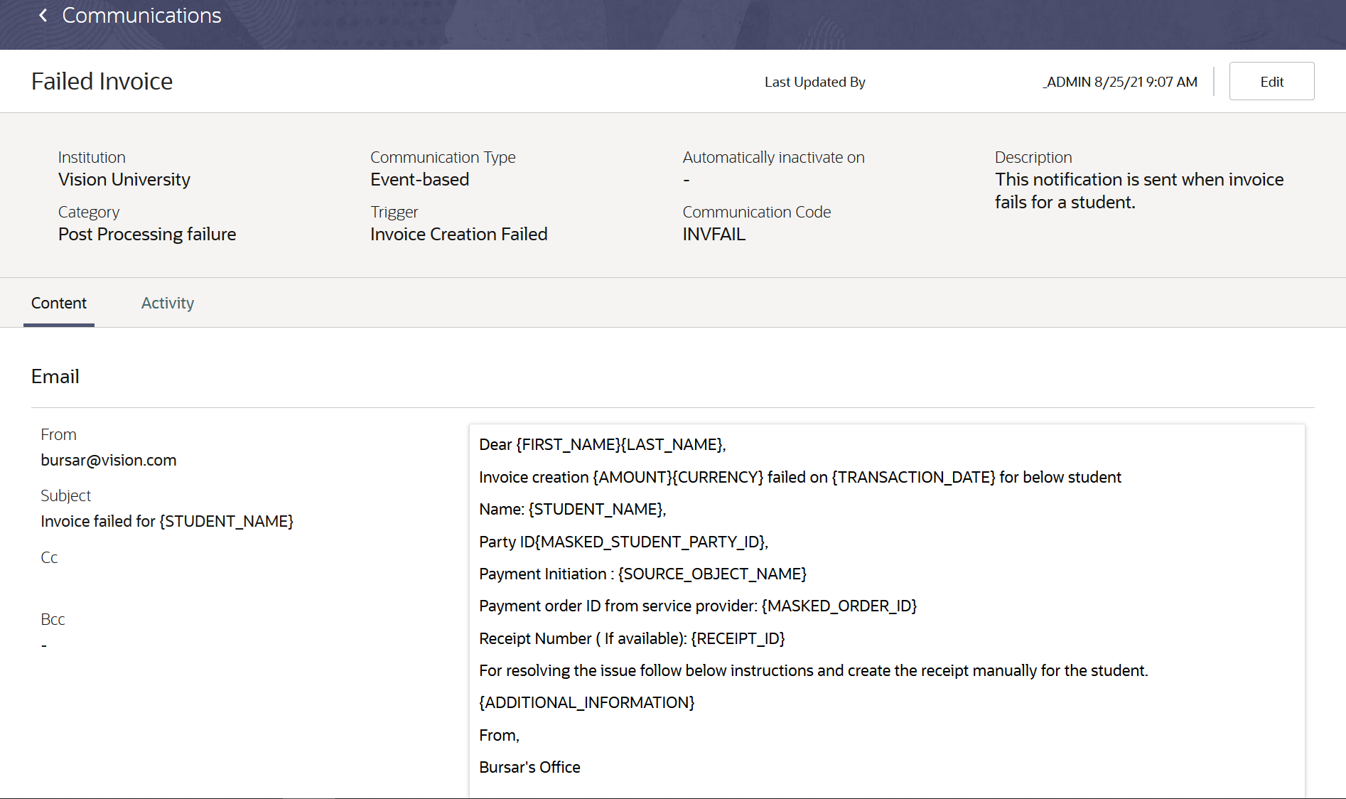 If the communication isn't set up for the appropriate categories and relevant message token, the email sent to administrators may have incomplete information that would prevent them from fixing issues.