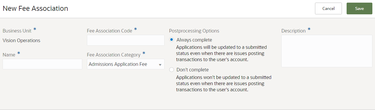 - Fill out the required fields, then select any one of the postprocessing options. Note: It's recommended to select Always complete to prevent students or applications from making multiple payments when there are issues in create invoices or receipts. The error message that users see will inform them that payment has been successfully collected, and that their accounts will be updated.
