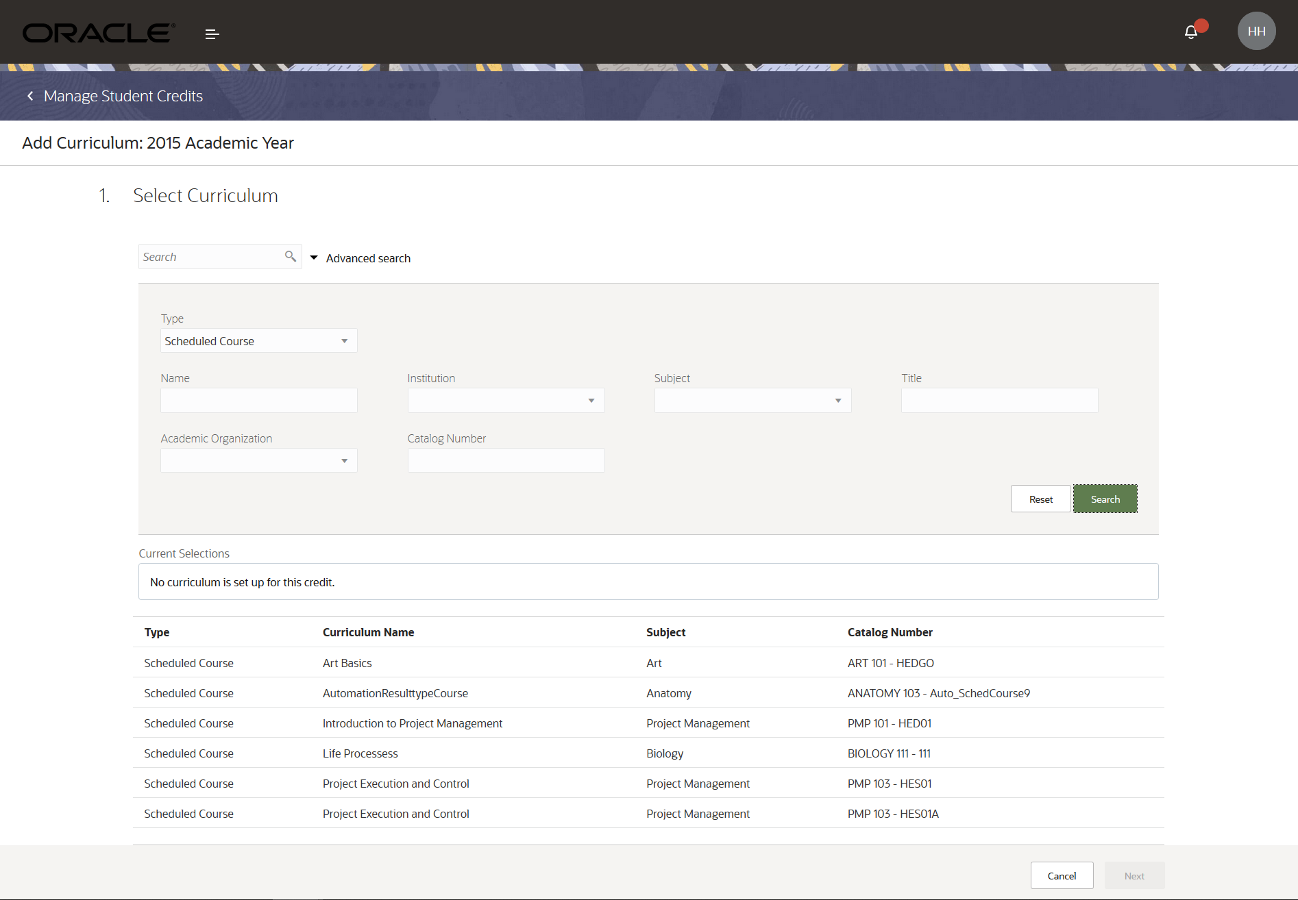 Once you add academic periods, you can add curriculum. On the Curriculum tab, you can select the academic period, then add curriculum. A guided task page appears. From this page, you can search for course or scheduled courses. And to add curriculum, just select from the list.