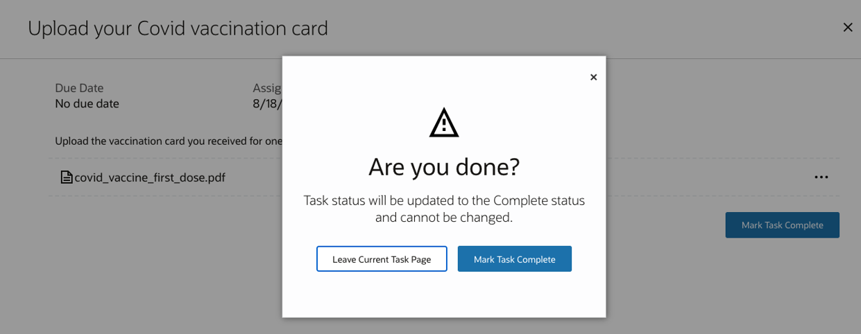 If your students forget to mark a document submission task complete or forget to change the status to complete after uploading a document, Student Management prompts them to mark the document submission tasks as complete while leaving the page. This reduces the number of In Progress tasks. When the task is marked complete, Student Management selects the default status matching the Complete status type for the defined status scheme for that task.