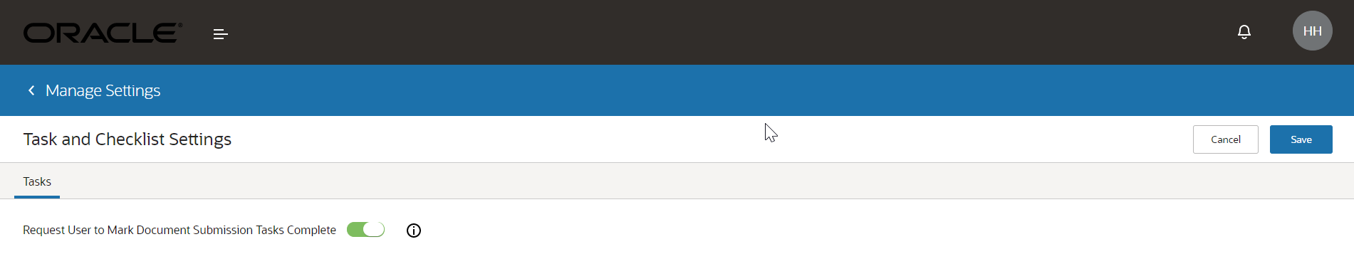 Go to Manage Settings > Task and Checklist Settings and click the toggle button to enable Request User to Mark Document Submission Tasks Complete setting.