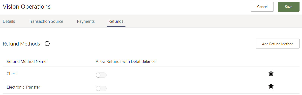 First, make sure you have implemented Oracle Fusion Financials correctly. It's important that you define payment methods. You also need to define the approval limits for every person who initiates the refund process. We highly recommend you consult a core Financials consultant, implementation partner, or systems integrator to help you set up Financials. For information about payment methods and approval limits, see: