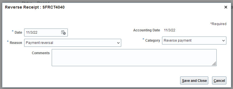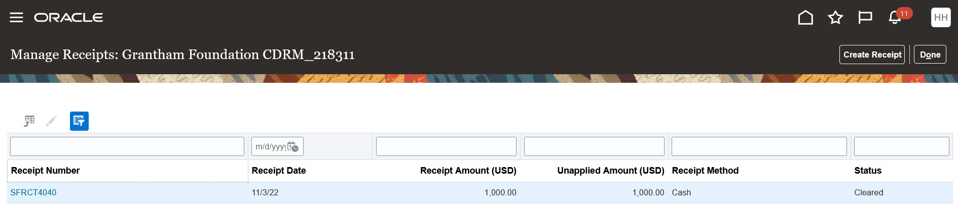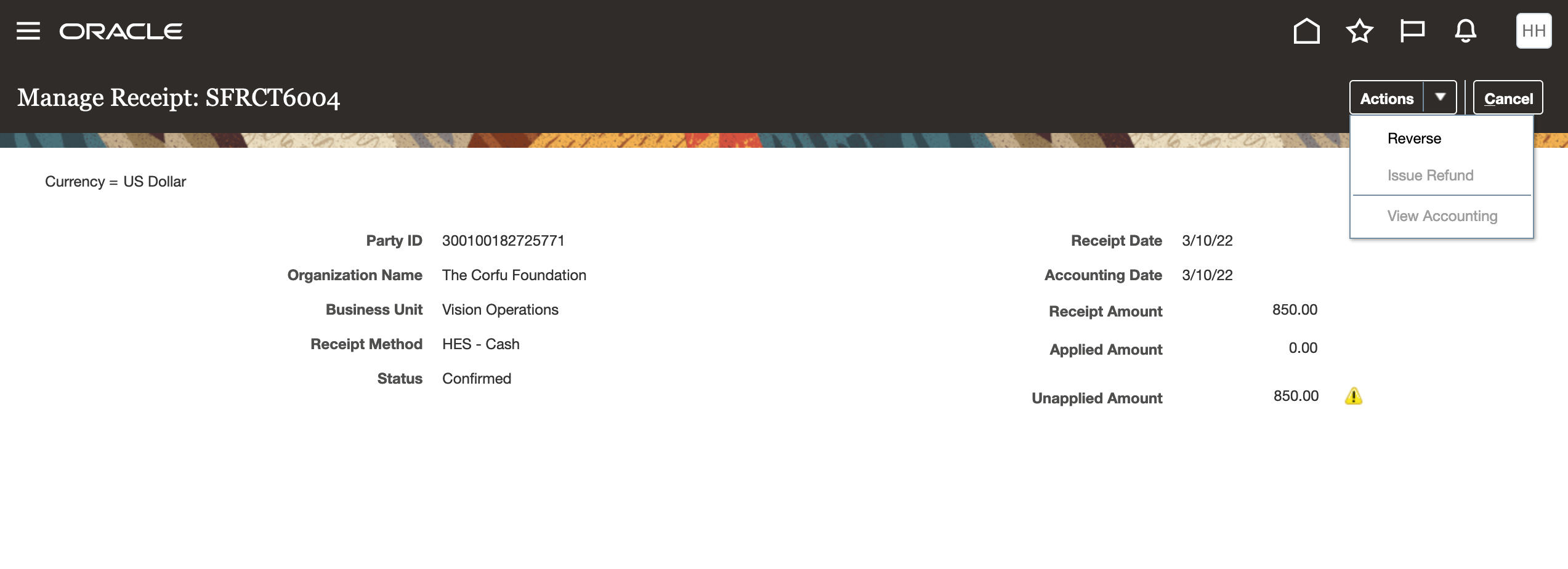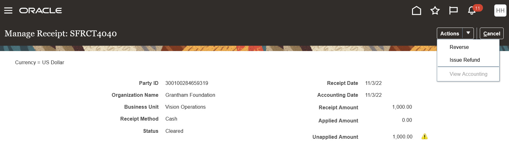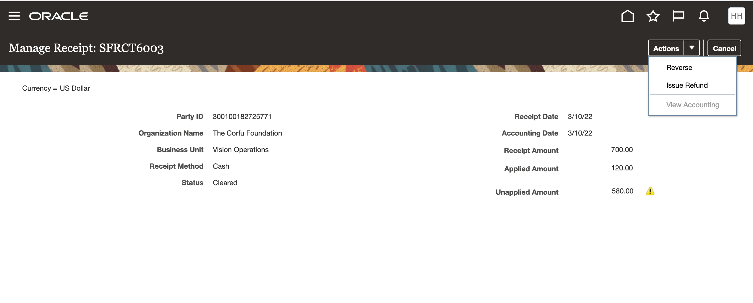 Now in this example, the receipt status is Cleared, so you can perform the action Issue Refund.