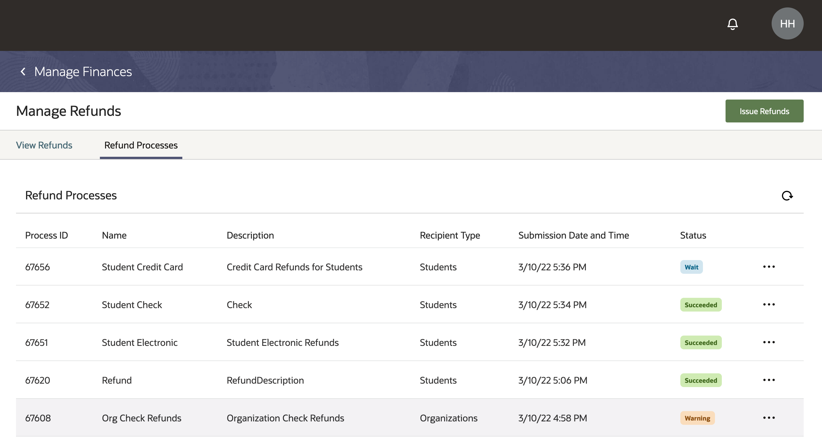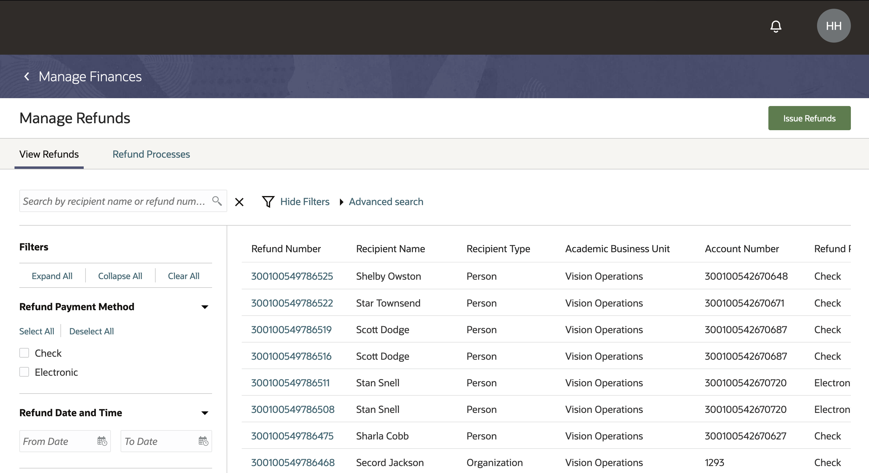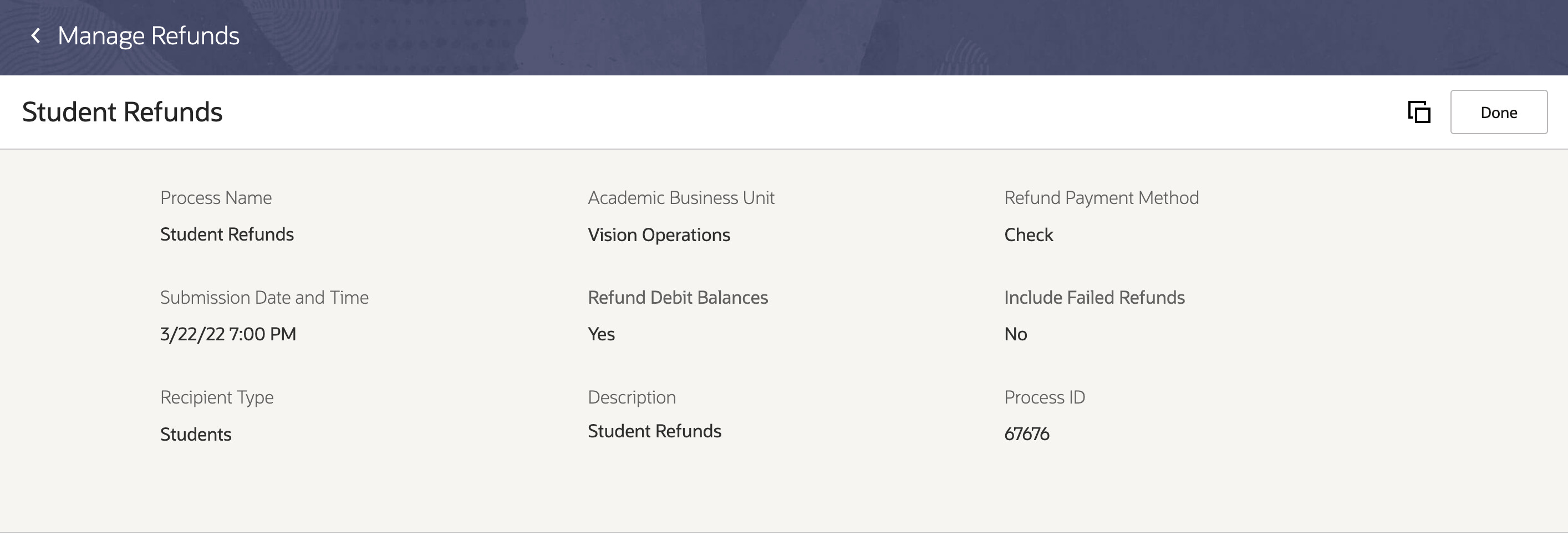 If you created refunds directly in Oracle Fusion Receivables, you may want to view those records directly in Student Management. If you choose to migrate those records, you'll be able to view them in Manage Refunds.