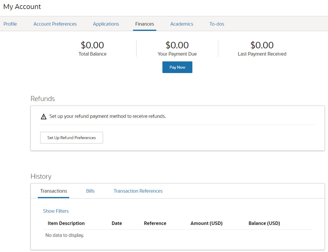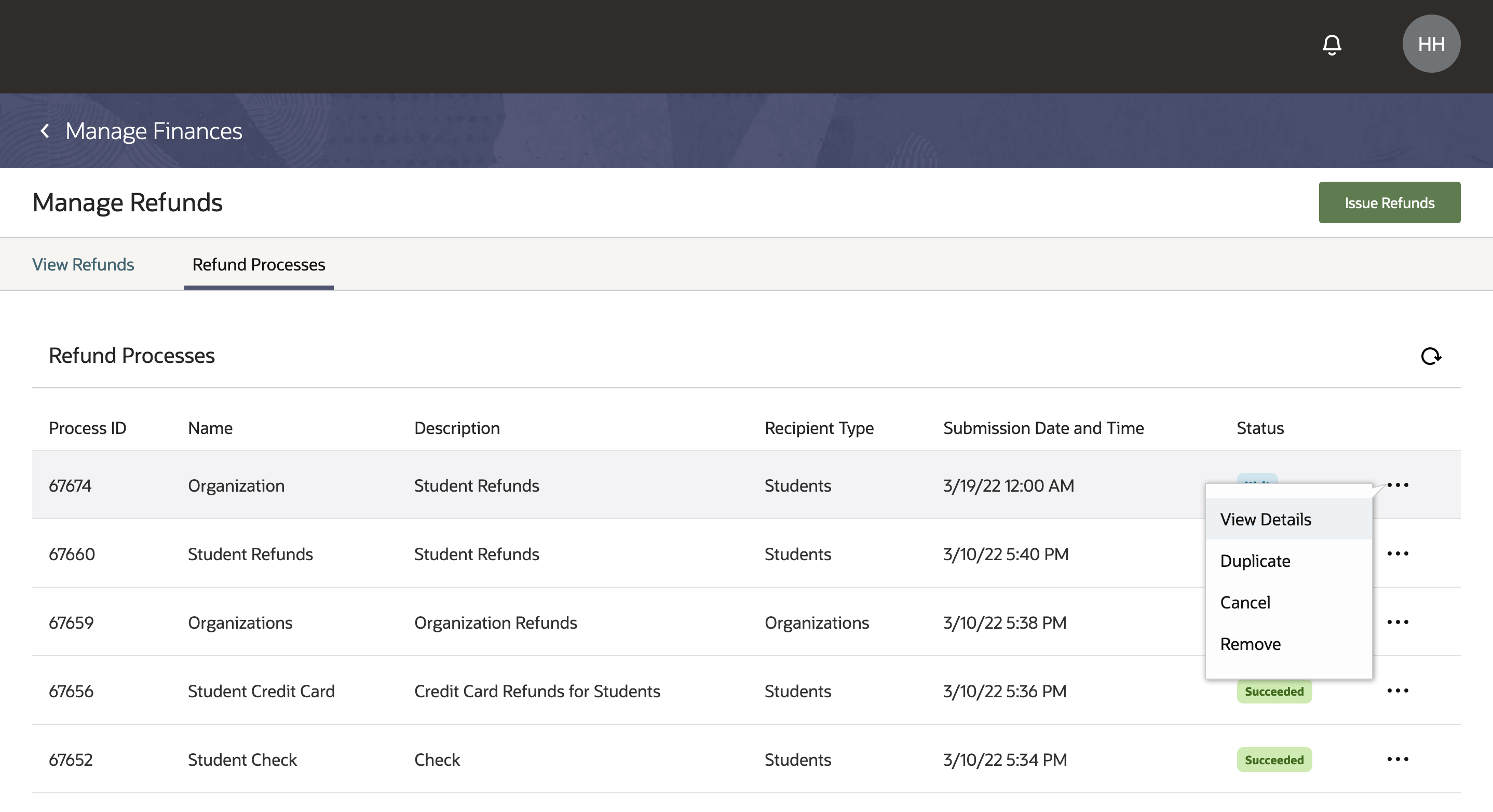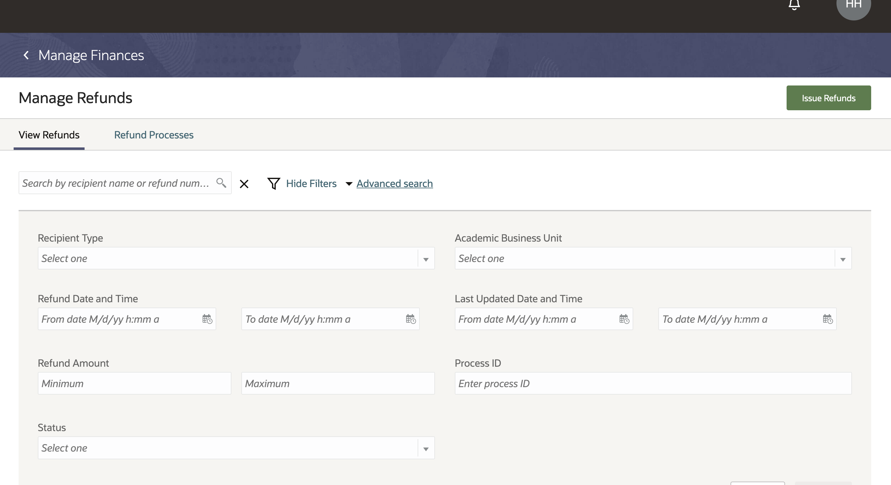 If you created refunds directly in Oracle Fusion Receivables, you may want to view those records directly in Student Management. If you choose to migrate those records, you'll be able to view them in Manage Refunds.