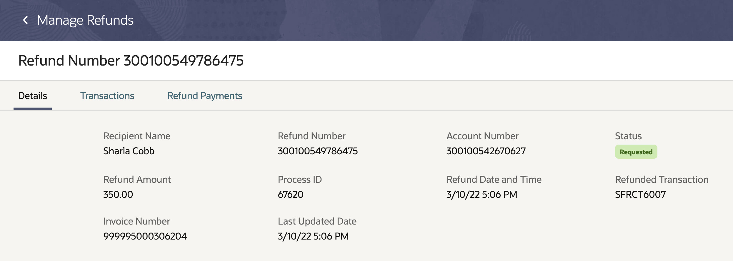 When you successfully run a refund request process, payment request invoices are created in Oracle Fusion Receivables. You'll still have to process the payments in Oracle Fusion Payables, or through the payment solution you're using.