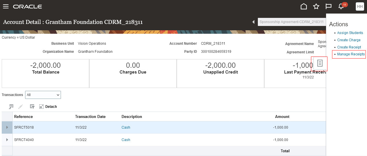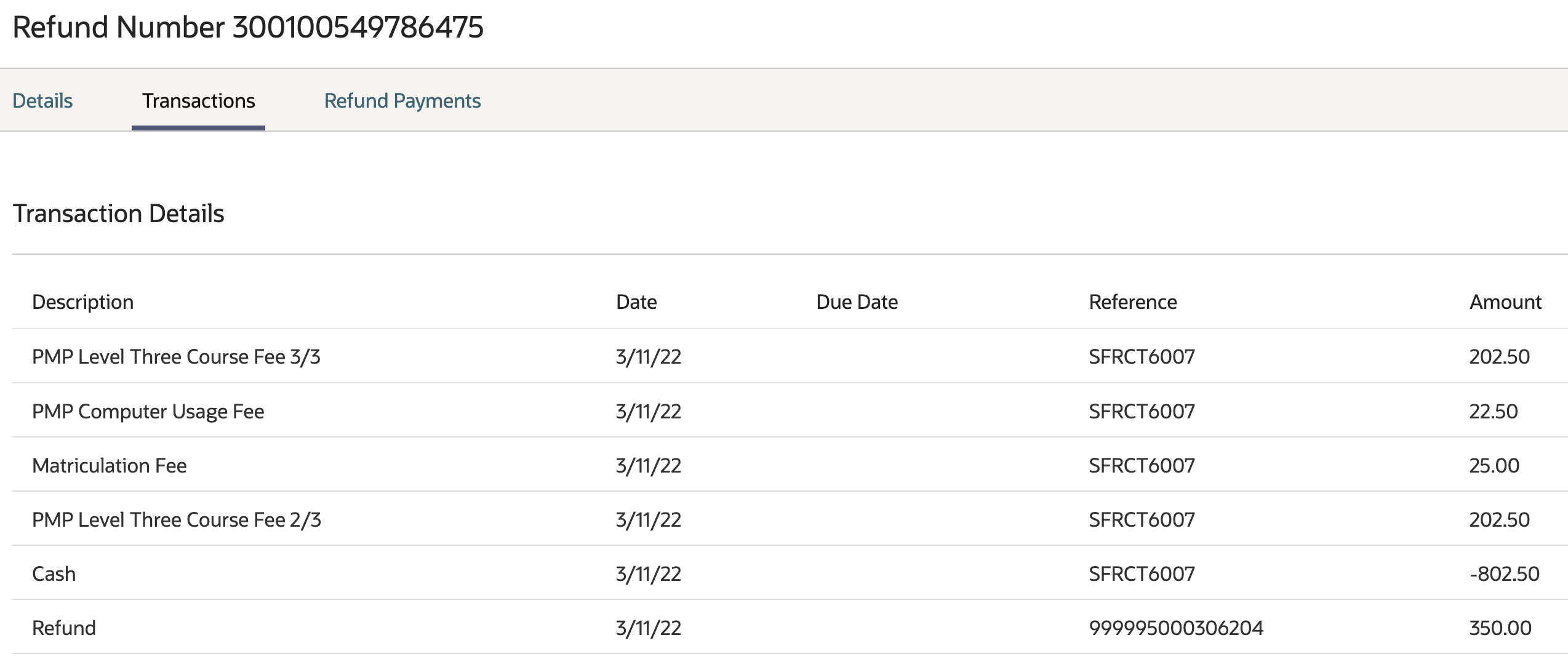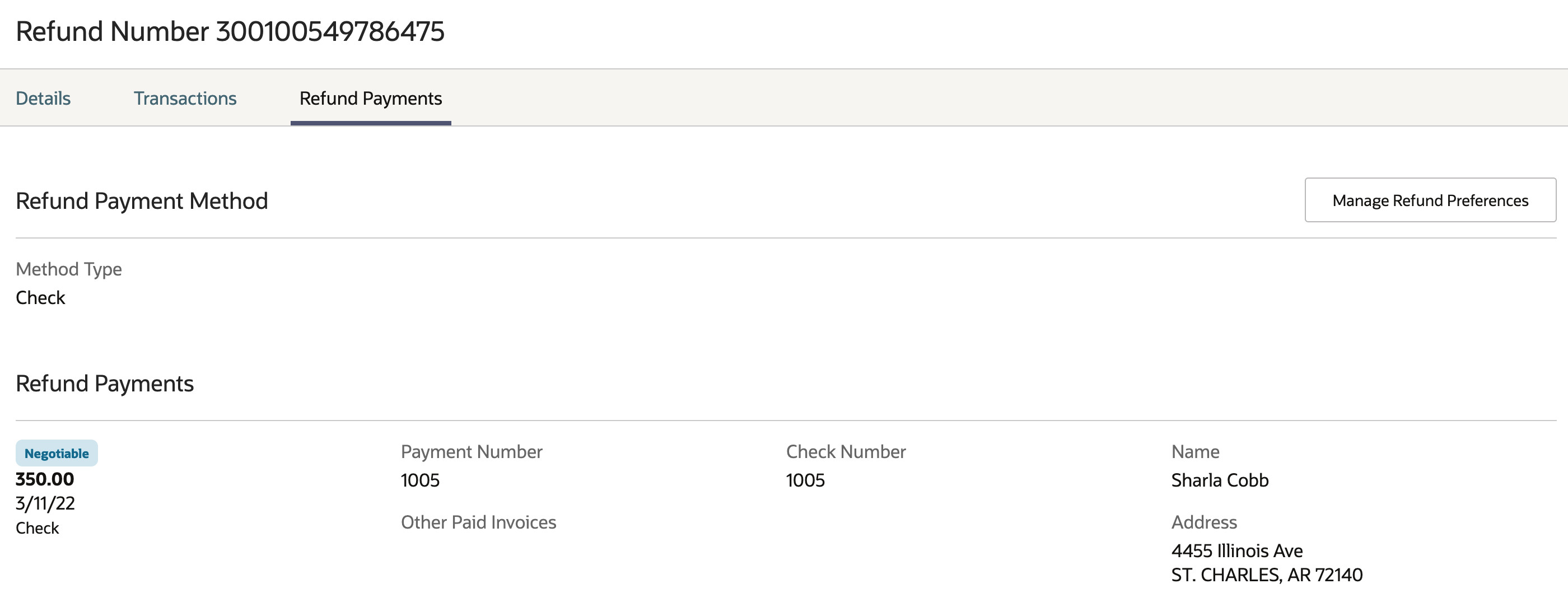 To access the Manage Refunds page, go to the Finances work area, then click Actions > Manage Refunds. When you click Refund Number, you will see detailed information about the refund.