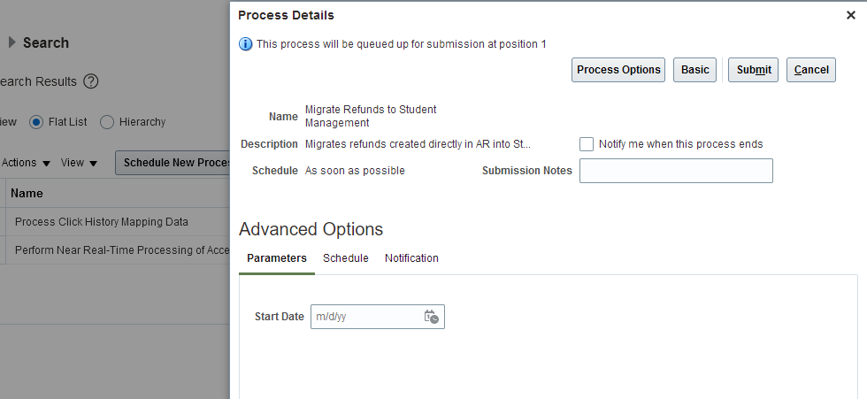 Go to Navigator > Tools > Scheduled Processes. Click Schedule New Process, then search for Migrate Refunds to Student Management.