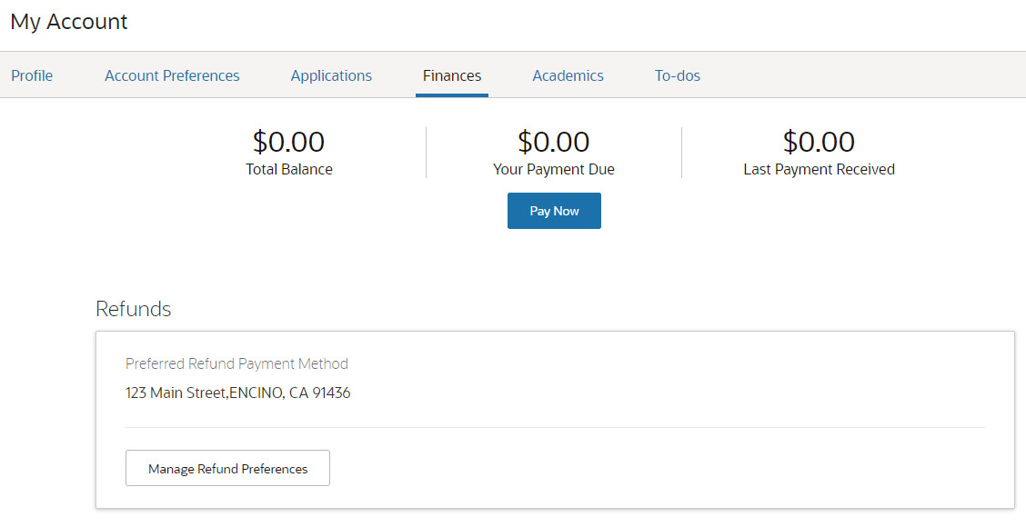 Individuals can easily add or update their refund method preferences. For example, if they prefer to receive refund payments through mailed checks, they can quickly update their address if it changes. Administrators or bursars can also add or update refund payment methods on behalf of students. To do so, go to a student's account, then from their account summary page, click Actions > Manage Refund Preferences.