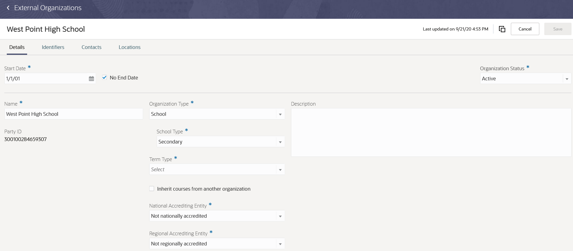 - Track and maintain more information about an external organization such as term type and accreditation entity.